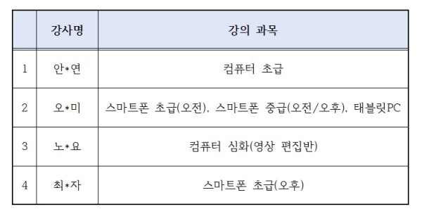 이 중 2023년 ICT사랑방 지식마루 프로그램에서 정보화교육을 진행할 4명의 강사님이 위와 같이 선정되었습니다.