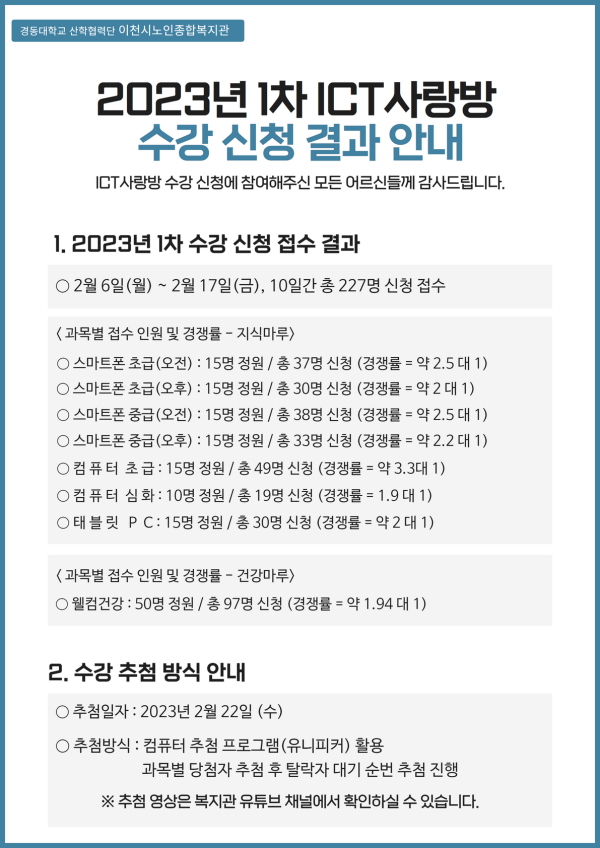 지난 2월 6일부터 17일까지 진행된 2023년 1차 ICT사랑방 수강 신청 결과를 안내해드립니다.