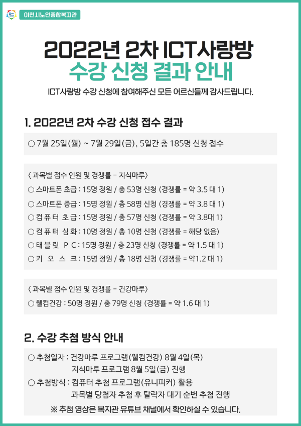 지난 7월 마지막 주(7.25~29)에 진행된 ICT사랑방 2차 수강신청 접수 결과를 위와 같이 안내 드립니다.