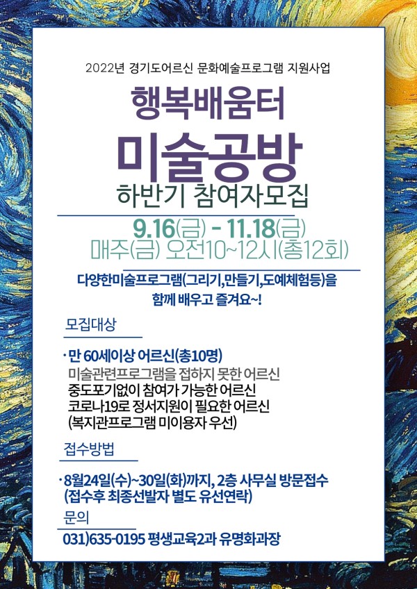 2022년 경기도 어르신 문화예술 프로그램 지원사업 "행복배움터 미술공방" 참여자를 모집합니다.