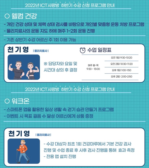 이천시노인종합복지관 ICT사랑방에서는 하반기(8~11월) 프로그램을 계획하고 위와 같이 수강 어르신을 모집합니다.