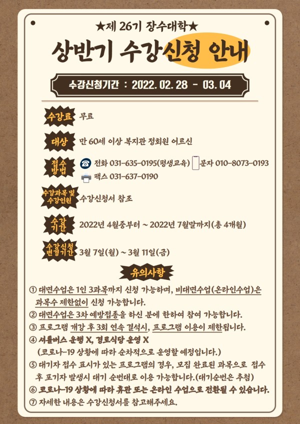 [모집] 2022년도 제26기 장수대학 프로그램 참여자 모집 및 수강신청 안내
