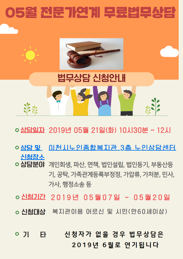 이천시노인종합복지관 노인상담센터에서는 2019년 05월 오형선법무사사무소에서 자원봉사를 지원하여 무료 법무상담을 실시하고자 합니다. 이에 상담을 원하시는 어르신은 3층 노인상담센터로 오셔서 신청해주시기 바랍니다.
