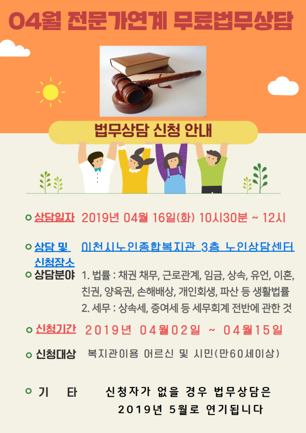 이천시노인종합복지관 노인상담센터에서는 2019년 04월 이천법무사합동사무소에서 자원봉사를 지원하여 무료 법무상담을 실시하고자 합니다. 이에 상담을 원하시는 어르신은 3층 노인상담센터로 오셔서 신청해주시기 바랍니다.