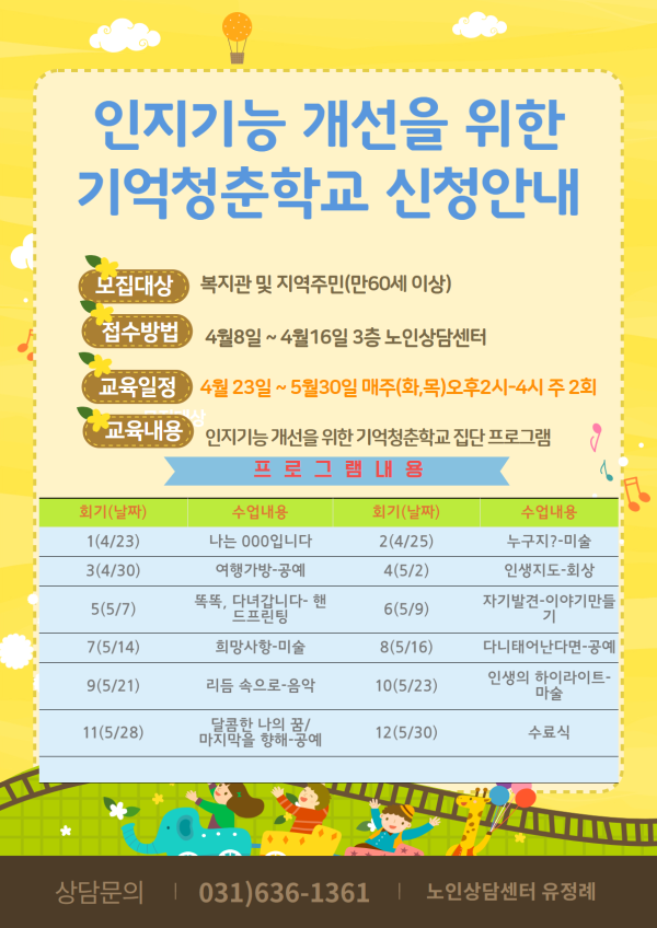 치매안심센터 연계 인지기능개선을 위한 기억청춘학교 프로그램 신청 안내