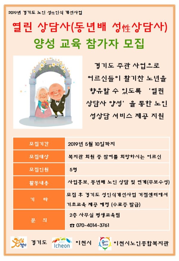 이천시노인종합복지관에서는 ‘동년배 성 상담사’를 모집하고 있습니다.