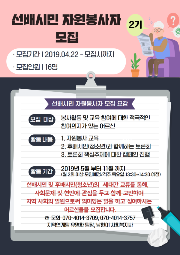 이천시노인종합복지관 지연연계팀에서는 선배시민 자원봉사자를 모집합니다!!