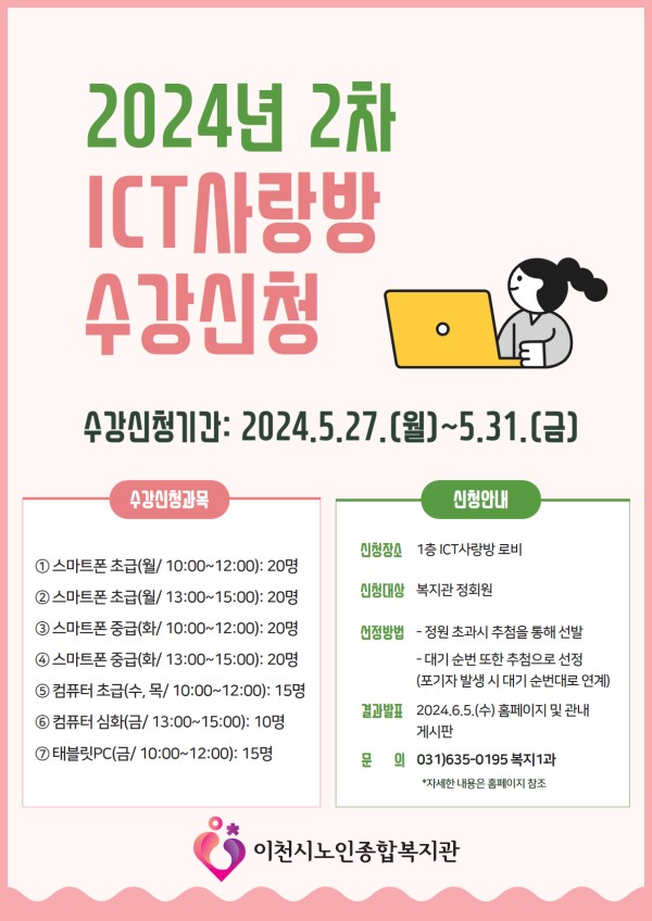 이천시노인종합복지관에서는 2024년 2차 ICT사랑방 프로그램 수강신청을 진행합니다.