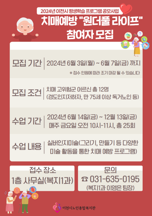 이천시노인종합복지관에서는 치매예방 고위험군 어르신을 대상으로 총 25주간 진행될 치매예방 프로그램「원더풀 라이프」참여자를 모집합니다.