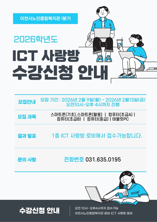이천시노인종합복지관에서는 2026년 제30기 상반기 장수 대학 프로그램 및 1차 ICT사랑방 프로그램 수강신청을 진행합니다.
