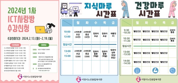 이천시노인종합복지관에서는 2024년 제28기 상반기 장수대학 프로그램 및 1차 ICT사랑방 프로그램 수강신청을 진행합니다.