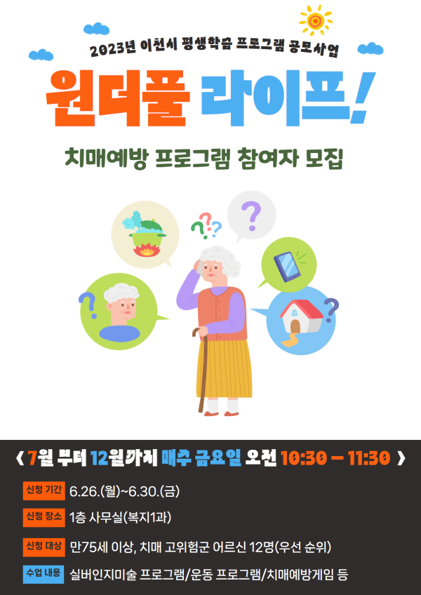 우리복지관 복지1과에서는 2023년 이천시 평생학습 프로그램 공모사업으로 선정된 치매예방 프로그램「원더풀라이프」에 참여할 어르신을 모집합니다.
