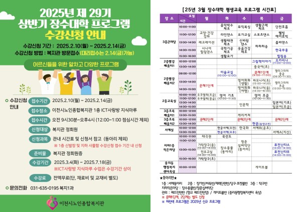 이천시노인종합복지관에서는 2025년 제29기 상반기 장수대학 프로그램 및 1차 ICT사랑방 프로그램 수강신청을 진행합니다.