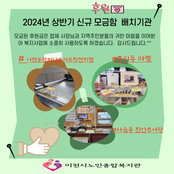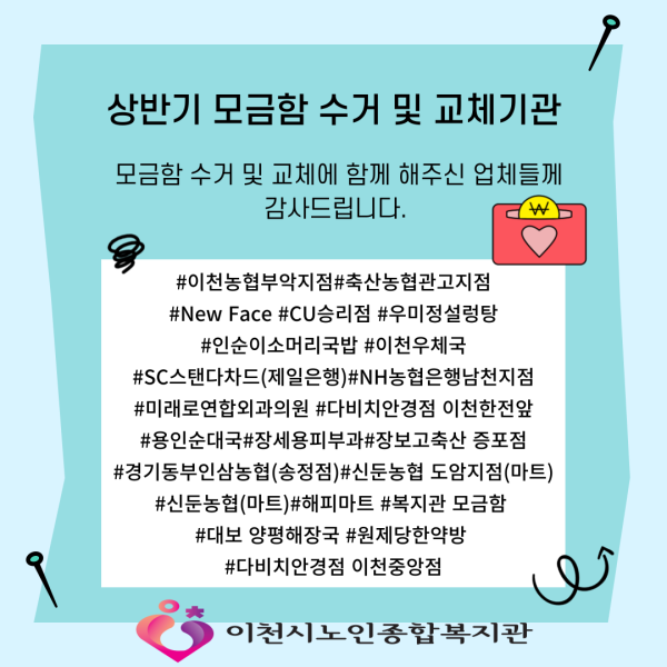 이천시노인종합복지관 상반기 모금함 수거 및 교체에 함께 해주신 업체들께 감사드립니다.