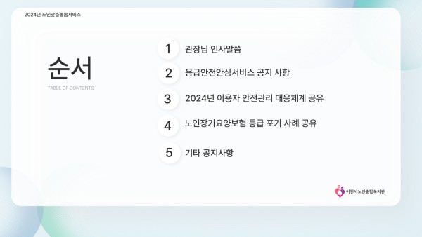 2월 정기회의는 관장님 인사말씀, 응급안전안심서비스 신규 사회복지사 인사 및 공지사항 전달, 2024년 이용자 안전관리 대응체계 공유, 노인장기요양보험 등급 포기 사례공유, 기타 공지사항 순으로 진행되었습니다.