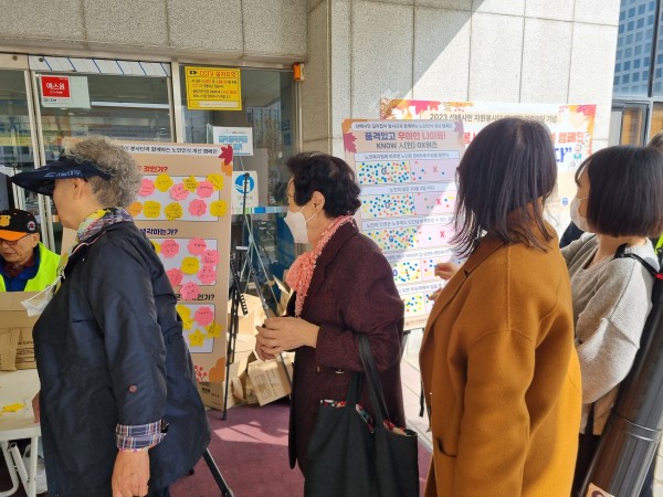 캠페인은 “노인의 긍정적 이미지 설문응답, 노인의식 OX퀴즈, 선배시민의 역할, 노인인식 개선을 위한 실천사항‘의 내용을 담은 2가지 피켓, 인식개선 서명, 기념품 증정 순으로 노인맞춤돌봄서비스사업 홍보활동과 함께 진행 되었습니다.