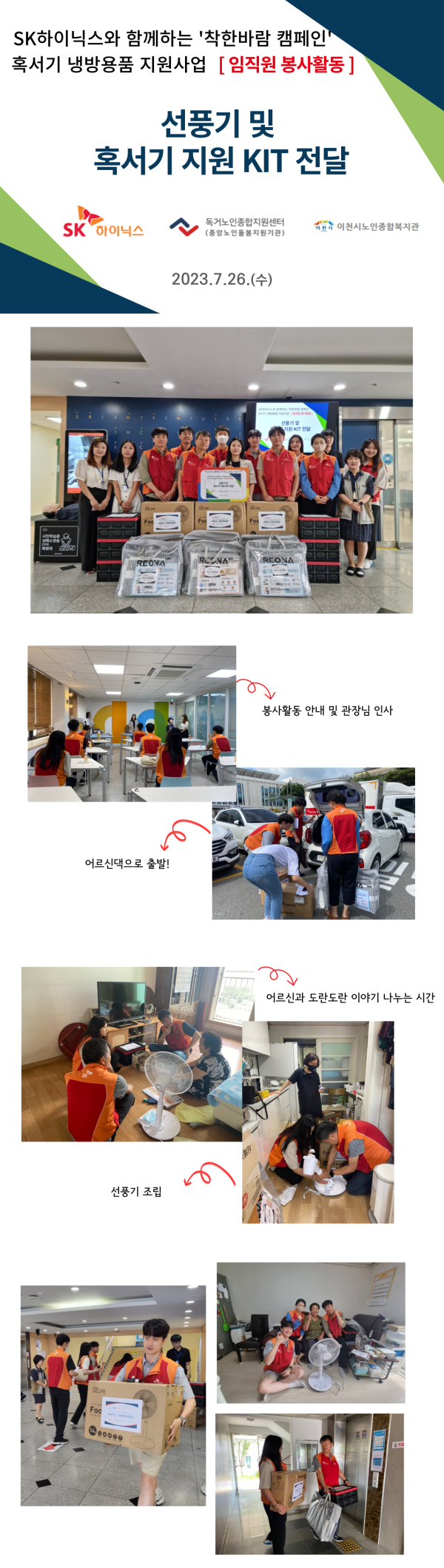 SK하이닉스 임직원 봉사단은 노인맞춤돌봄서비스 어르신 댁에 방문하여 선풍기 조립 및 혹서기 지원 KIT(이불, 삼계탕, 곰탕, 두유, 쿨토시)지원, 폭염 주의 안내, 어르신 말동무 등의 봉사활동을 진행하였습니다.