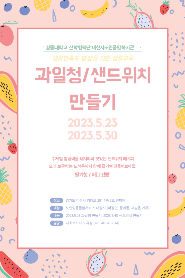 노인맞춤돌봄서비스 어르신과 함께하는 "생활만족도 향상을 위한 생활교육" 다섯 번째 시간으로는 '과일청 / 샌드위치 만들기' 활동을 진행했습니다 !
