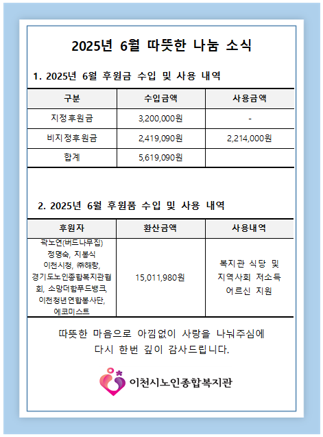 복지2과 [복지2과] 2025년 6월 후원금품 소식 페이지 정보 작성자이천노인종합복지관 작성일2025-07-25 조회수 38 본문 아낌없는 사랑에 깊이 감사드립니다. 이전글[복지2과] 2025년 7월 후원금품 소식 2025-08-19 다음글[복지2과] 2025년 5월 후원금품 소식 2025-06-20 목록