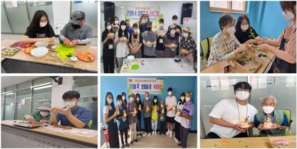 5일에는 월남쌈 만들기와 유리돔공예 활동을, 12일에는 떡갈비 만들기와 공예화분 만들기 활동이 진행되었습니다. 참여 어르신들은 청소년들의 도움을 받아 요리와 공예품을 완성하였고, 활동 내내 어르신들과 청소년들은 끊임없이 소통하며 세대 간의 이해의 폭을 넓히는 시간을 가졌습니다.
