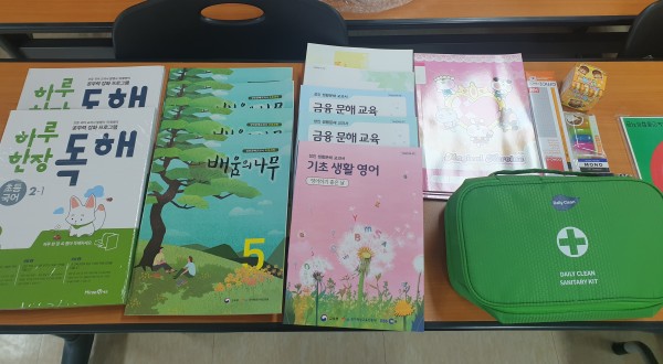 학습꾸러미 안에는 코로나-19 방역키트 파우치, 학습 교재 12종, 각종 문구류가 들어있어 어르신들이 집 안에서도
