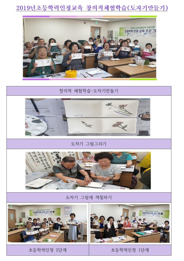 ● 2019년 『국가평생교육진흥원』의 평생학습도시 지역특성화 지원사업 창의적 체험프로그램을 실시 하였다. 창의적 체험프로그램을 통해 새로운 교육활동에 대한 두려움을 없애고, 초등학력인정교육에 대한 흥미를 높이고자며 강의식 수업이 아닌 매월 다양한 창의적 체험 수업으로 마음의 안정감을 주고자 한다.