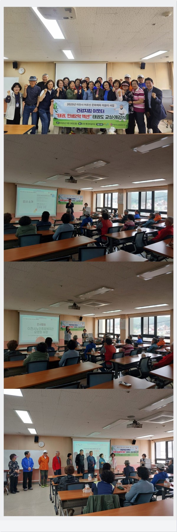 우리복지관에서는 ‘건강지킴 이웃터 “태권, 인생 2막 액션” 태권도 교실’의 개강식이 5월 26일에 진행되었습니다. 이번 행사는 2025년 어르신 문화체육 이음터 사업의 일환으로, 어르신들이 건강한 삶을 영위할 수 있도록 돕기 위한 프로그램으로 많은 어르신들이 참석하여 태권도에 대한 흥미와 기대감을 드러냈답니다.