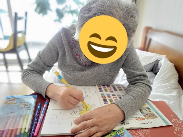 함께 인지활동 북과 만다라 컬러링 북을 진행하는 시간을 가졌고 방문 이외에도 대상자 스스로 교재들을 진행하며